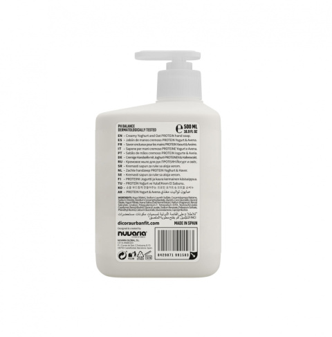 Kremowe mydło do rąk wzbogacone o proteiny z jogurtu i ekstrakty owsiane. Nawilżające mydło do rąk o kremowej konsystencji do skóry wrażliwej. Proteiny z jogurtu i owsa koją skórę, poprawiają elastyczność i dają efekt odświeżenia.