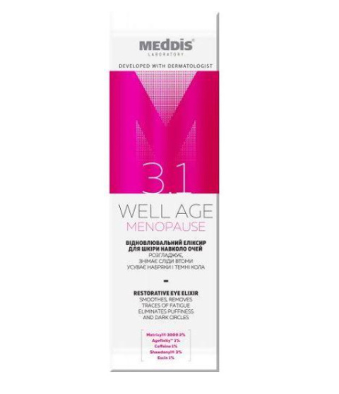 Meddis Well Age Menopause Eliksir to innowacyjna formuła stworzona specjalnie dla potrzeb dojrzałej skóry w okresie menopauzalnym. Dzięki potężnemu połączeniu Matrixyl 3000 2%, Agefinity 1%, kofeiny 1%, Shadowyl 3% i escyny 1%, eliksir intensywnie regeneruje, ujędrnia i rozświetla delikatną skórę wokół oczu, redukując cienie, worki i drobne zmarszczki.