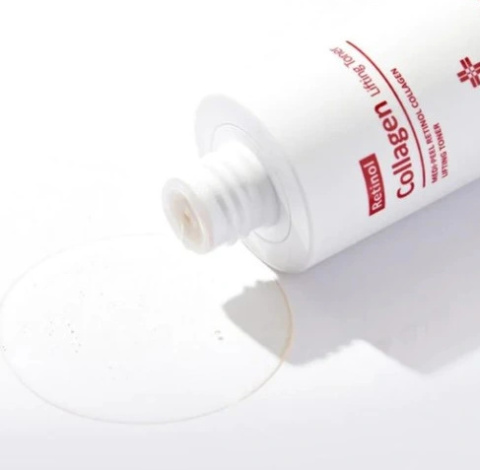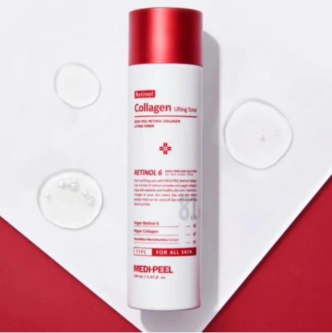Medi-Peel Retinol Collagen Lifting Toner uelastycznia i ujędrnia skórę, wygładza i napina, obkurcza rozszerzone pory i wygładza mikrozmarszczki.